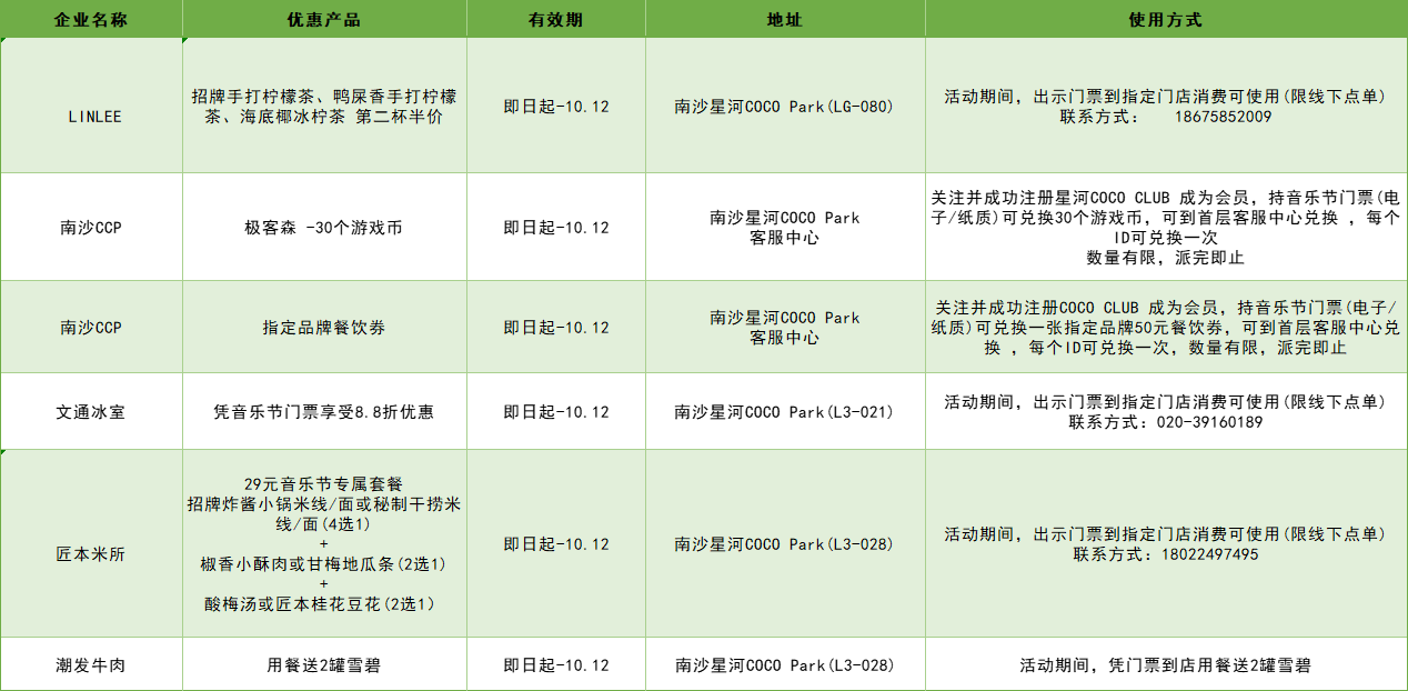 为迎接音乐节,南沙多家餐饮门店也推出了专属福利,覆盖粤菜、东南亚菜、咖啡等多个品类,且部分优惠有效期长达数月,为乐迷带来味觉与福利的双重满足。